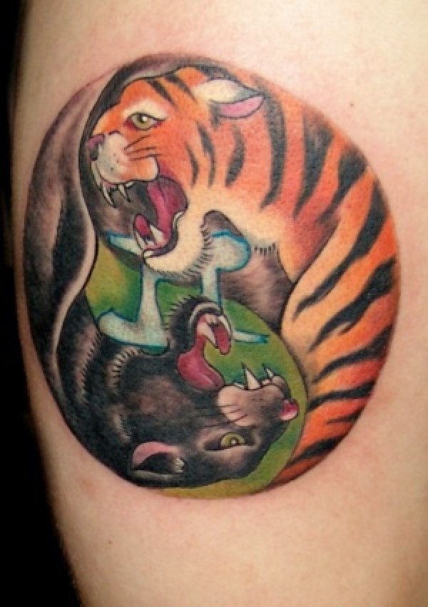 肩部彩色豹和虎阴阳纹身图片