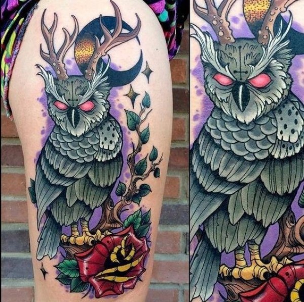 新传统风格的彩色恶魔猫头鹰纹身图片