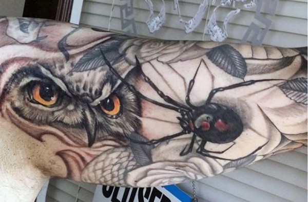 手臂彩色猫头鹰与蜘蛛纹身图案