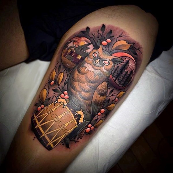 腿部彩色大猫头鹰与鼓纹身图案
