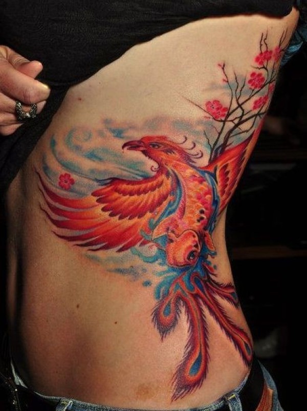腰侧彩色红凤凰纹身图案
