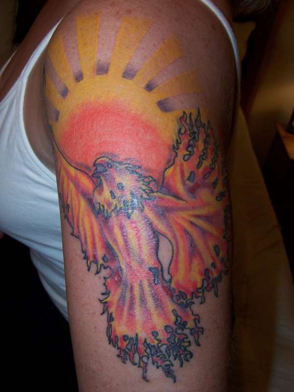 肩部彩色凤凰和太阳纹身图案