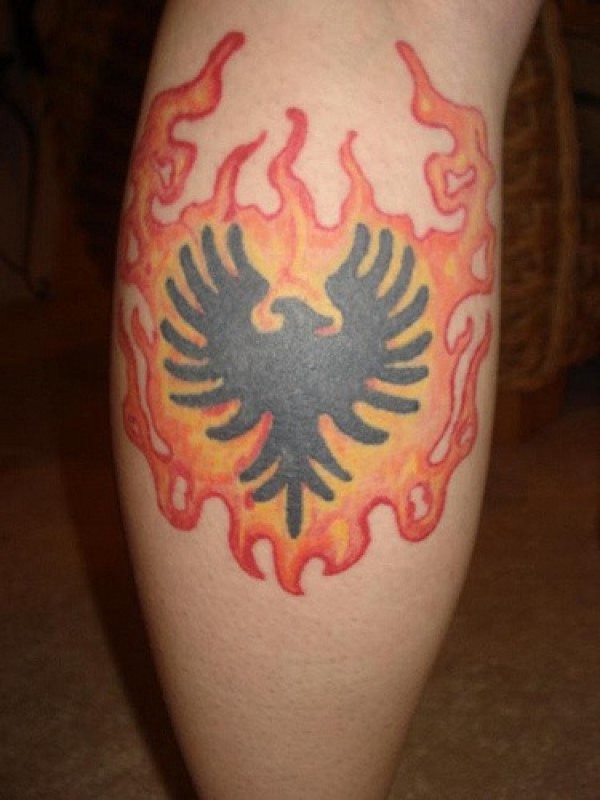 手臂彩色火焰中的凤凰符号纹身图片