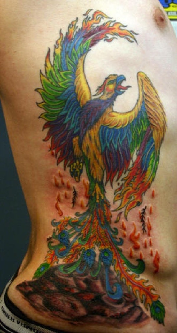 男性腰侧彩色凤凰升起纹身图案