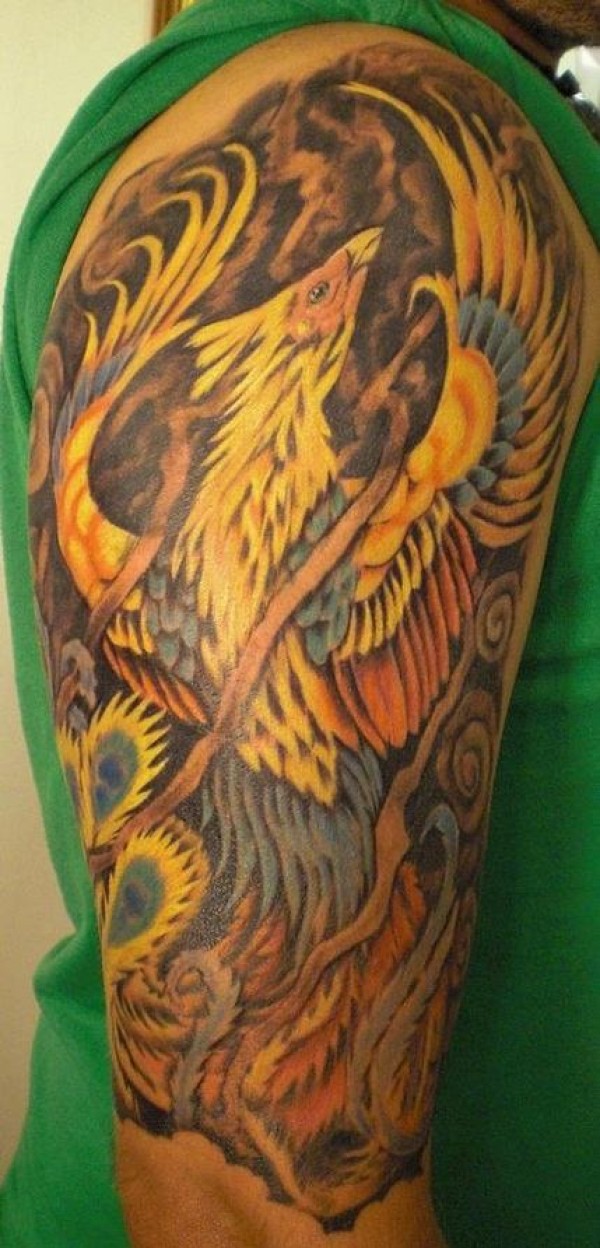 肩部彩色上升凤凰袖纹身图案