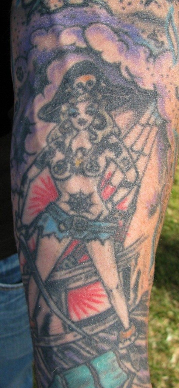 花臂彩色海盗船的丫头纹身图案