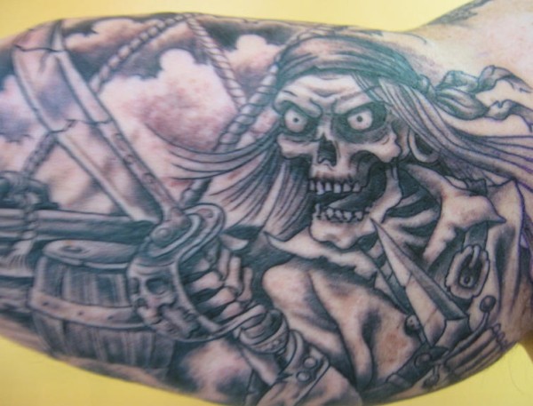 手臂黑棕色愤怒的海盗骷髅纹身图案