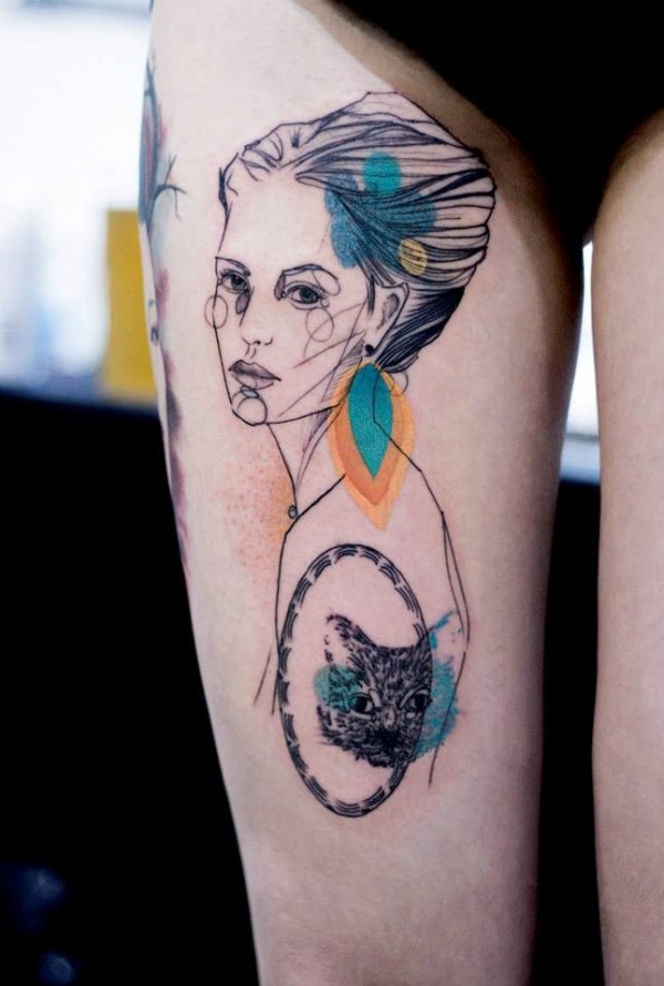 腿部素描式彩色女性肖像纹身图案