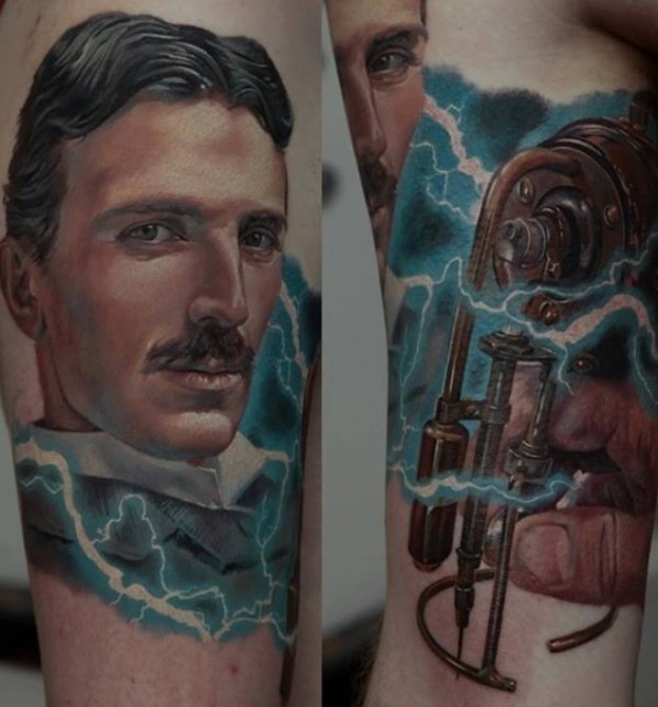 腰侧彩色尼古拉特斯拉肖像纹身图片