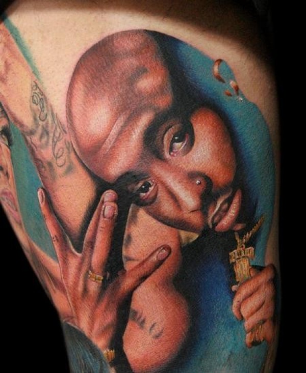 腿部现实主义风格的彩色肖像纹身图案