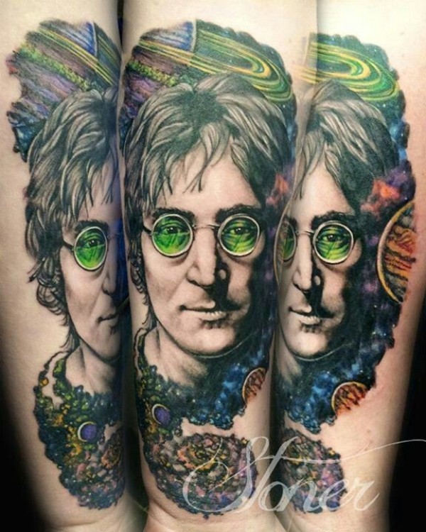 手臂彩色列侬肖像与空间纹身图案