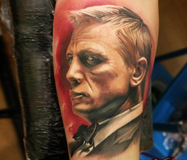 腿部彩色詹姆斯·邦德肖像纹身图案