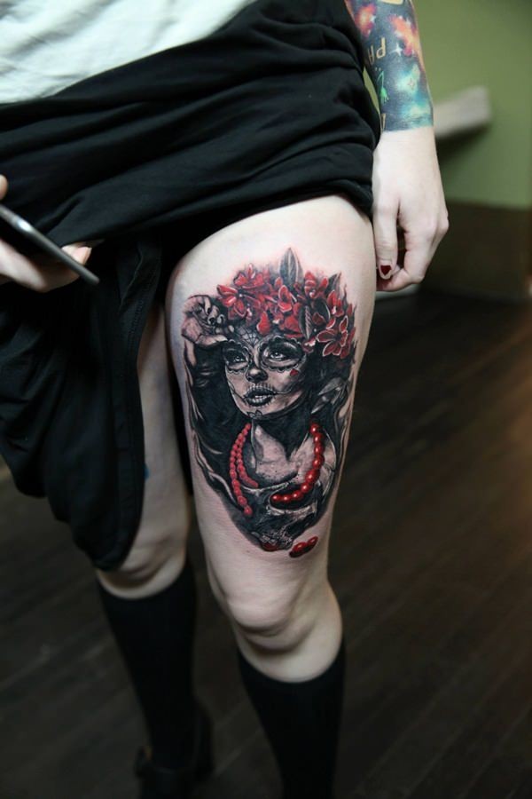 腿部彩绘女子肖像纹身图案