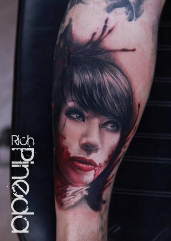 手臂逼真的彩色吸血鬼女人肖像纹身图片