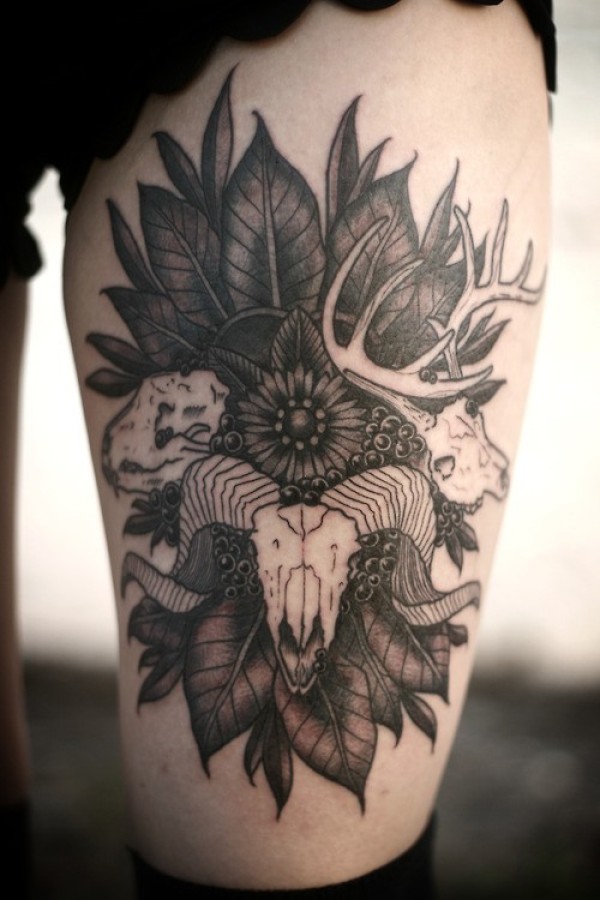 腿部黑灰色公羊头与花纹身图案