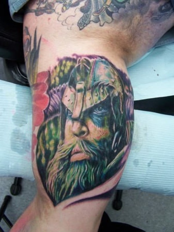 手臂彩色肖像戴头盔的维京战士纹身图案