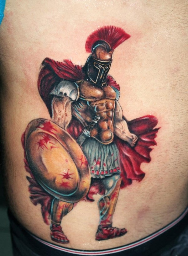 腰侧彩色雄伟的斯巴达战士纹身图案