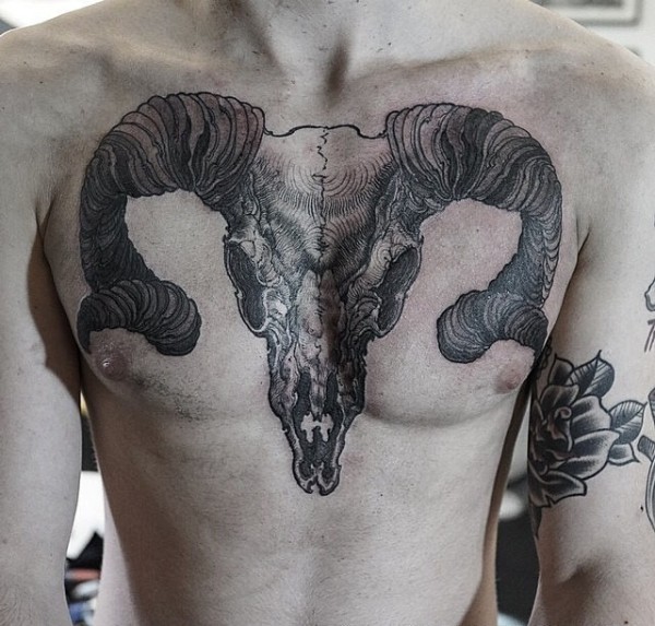 男性胸部黑墨水羊骷髅纹身图案