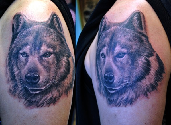 肩部黑棕色狼头Wolf tattoo纹身图案