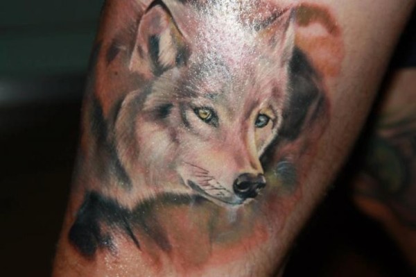 腿部水彩写实狼头纹身图案