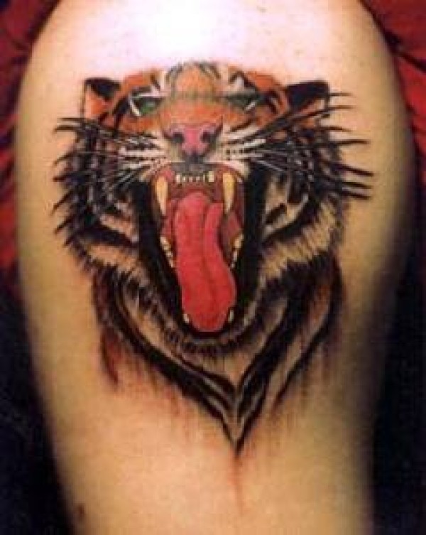 肩部超级逼真的咆哮的老虎纹身图片