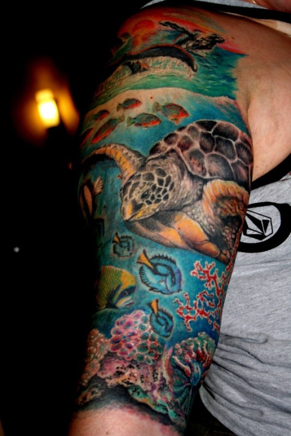 肩部非常逼真的彩色大龟纹身图案