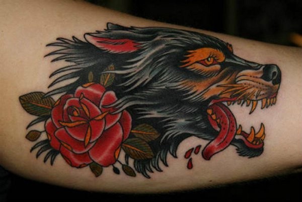 传统的老式狂暴血腥的狼和红色玫瑰纹身图片