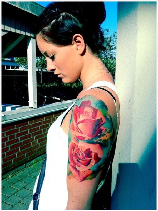 女性肩部彩色逼真的巨大的玫瑰纹身图案