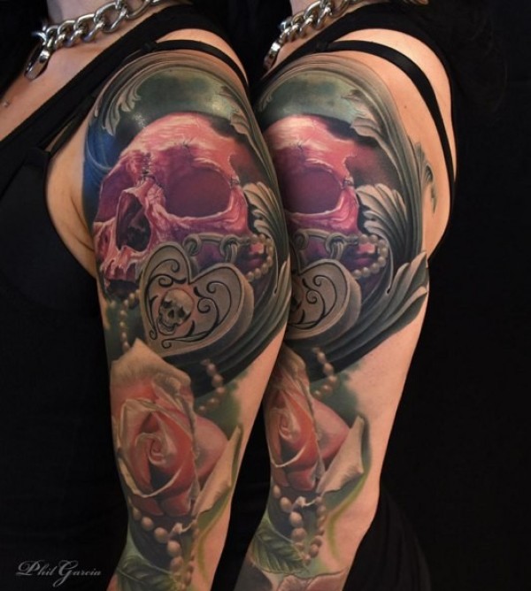 肩部彩色带有玫瑰色和骷髅纹身图片