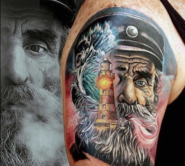 肩部非常逼真的彩色老水手纹身图片