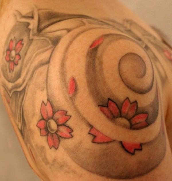 肩部彩色花朵旋转纹身图案