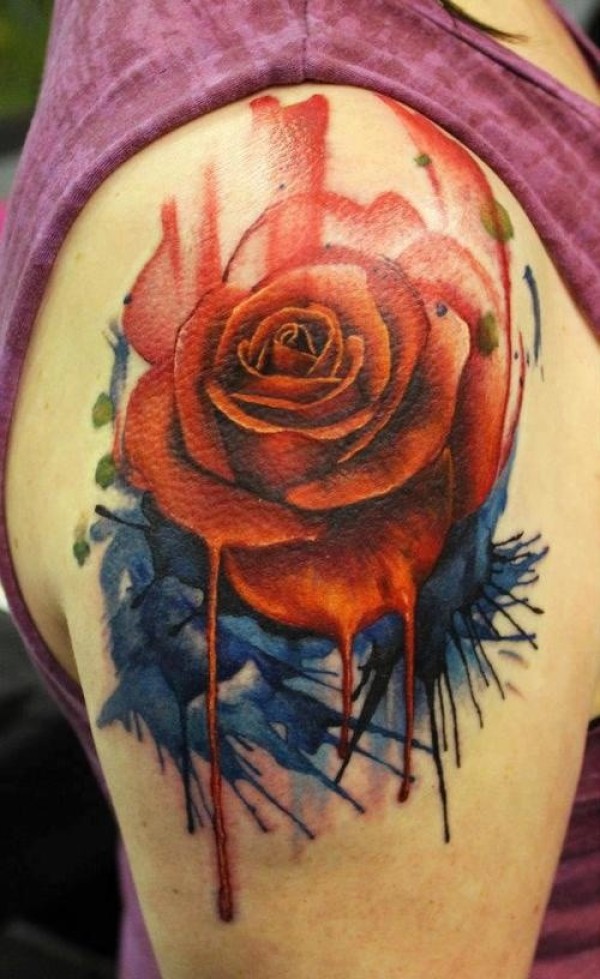 肩部水彩逼真的玫瑰花纹身图案