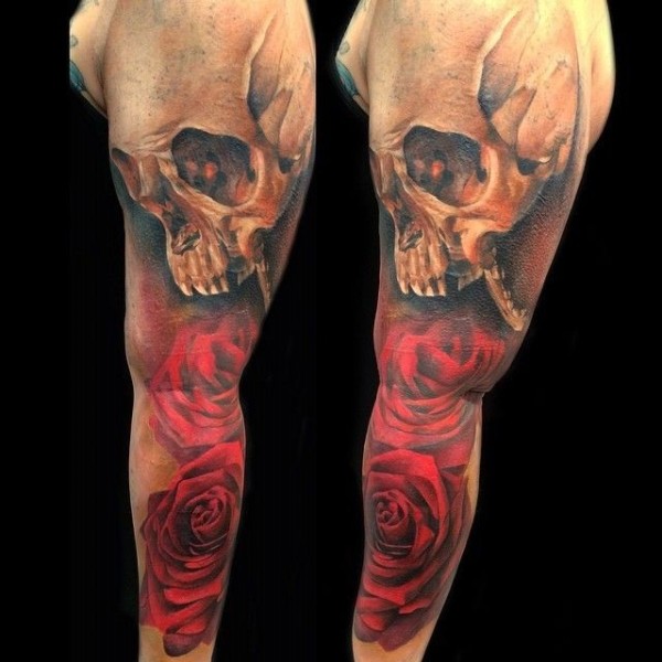 手臂彩色组合红玫瑰与人类头骨纹身图案