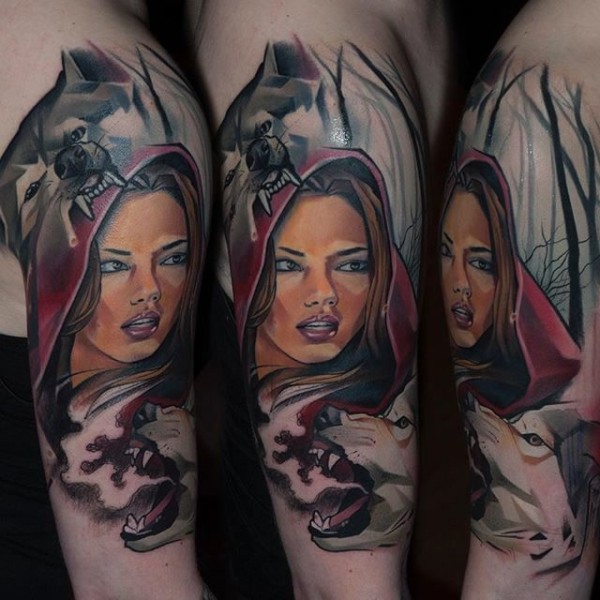 新学校风格的肩膀红帽女郎和狼纹身图案