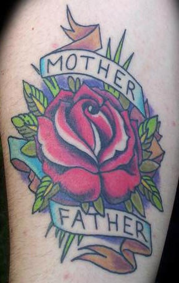 腿部彩色红玫瑰英文纹身图案