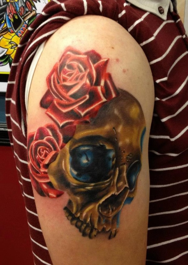 新传统风格彩色金头骨与红玫瑰纹身图案