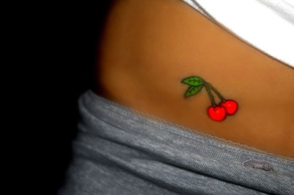腰部彩色明亮的红樱桃纹身图案