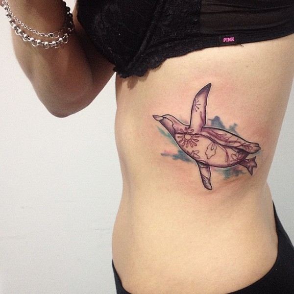 女性腰侧简约飞企鹅纹身图案
