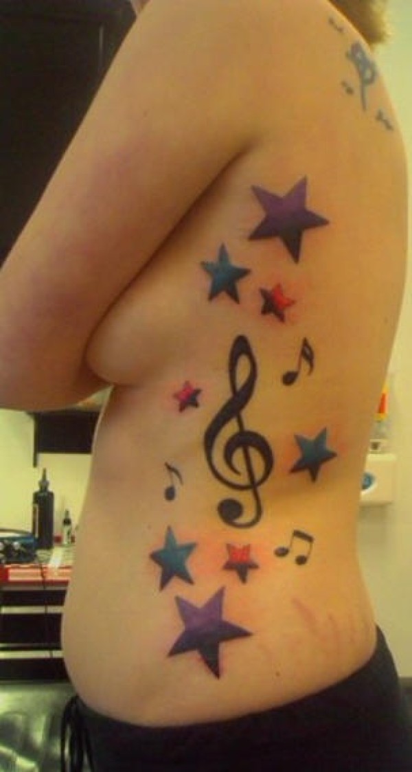腰侧彩色高音谱号的五角星和旋律纹身图案