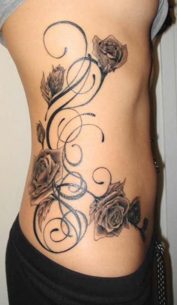 腰侧黑灰别致的黑色玫瑰纹身图案