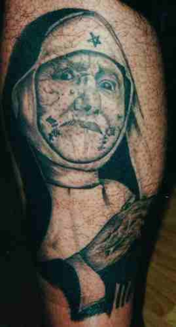 腿部黑灰非宗教的暴徒修女的纹身图案