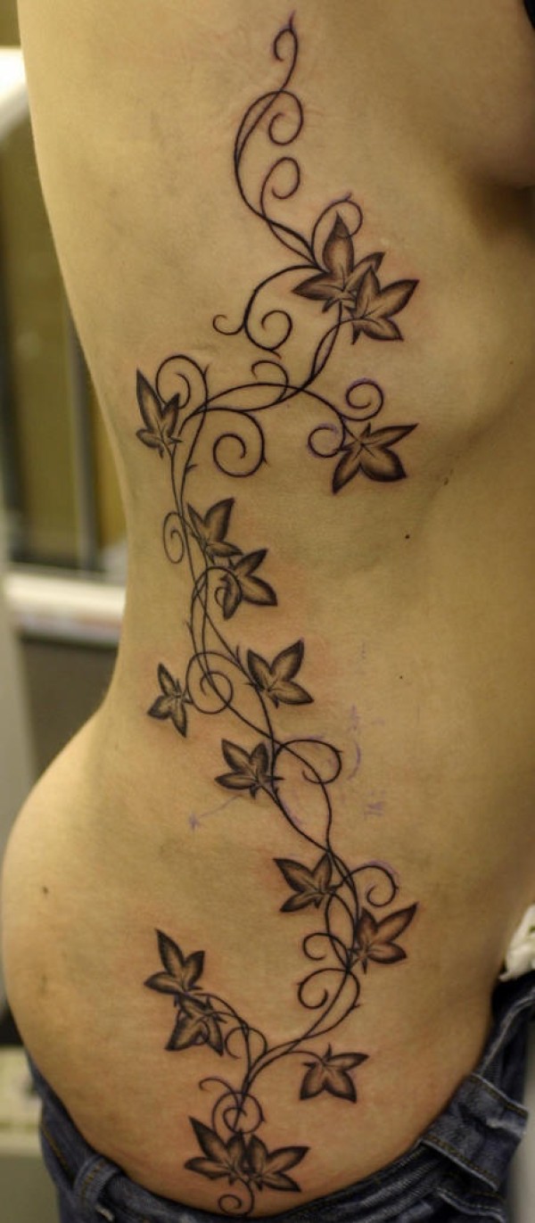 腰侧黑灰色长有趣叶子藤蔓纹身图案