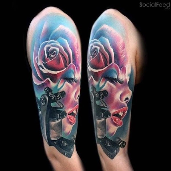 新风格的彩色美女与玫瑰纹身图案