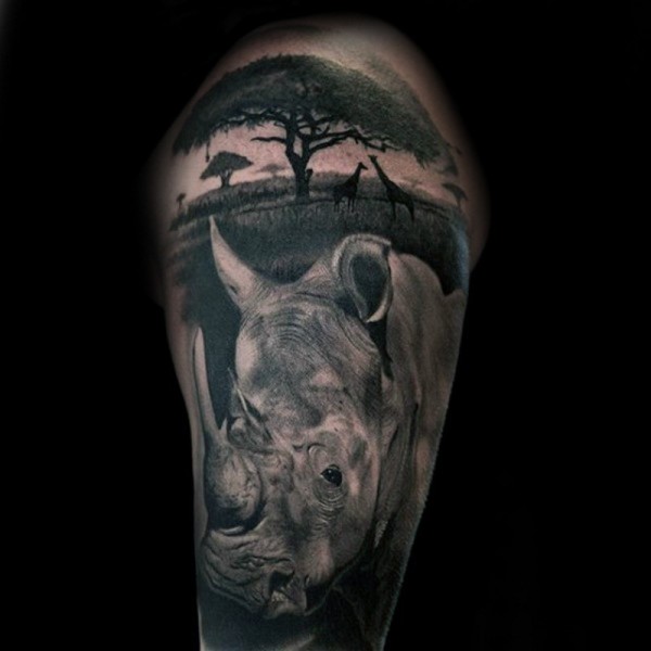 肩部华丽壮观的野生动物与犀牛纹身图案