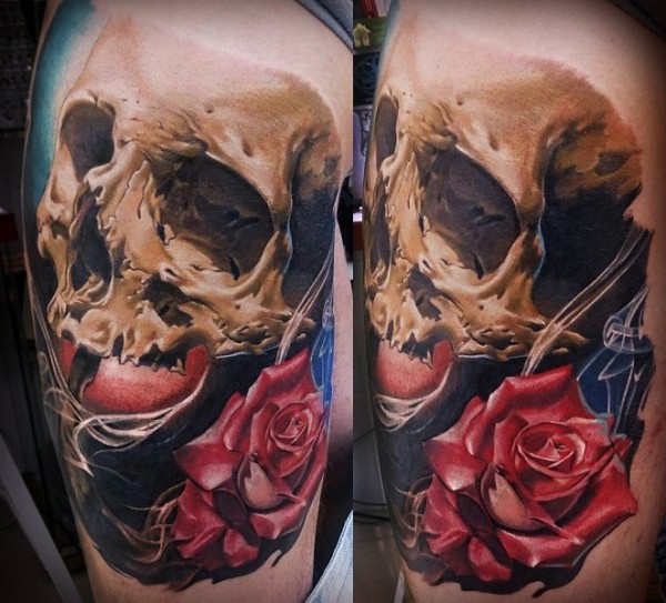现实主义风格的彩色骷髅和玫瑰纹身图案