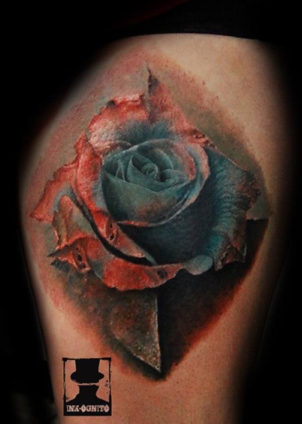腿部彩色现实主义风格华丽的玫瑰纹身图案