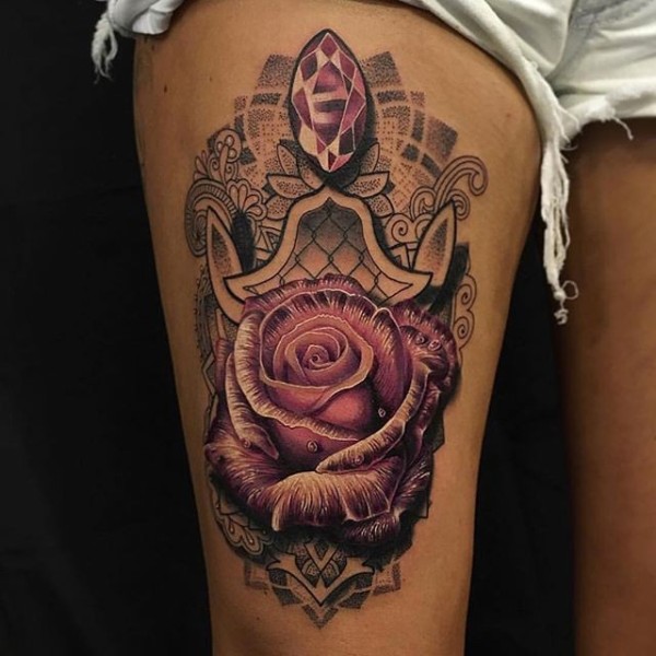 腿部彩色大玫瑰和印度教的纹身图案