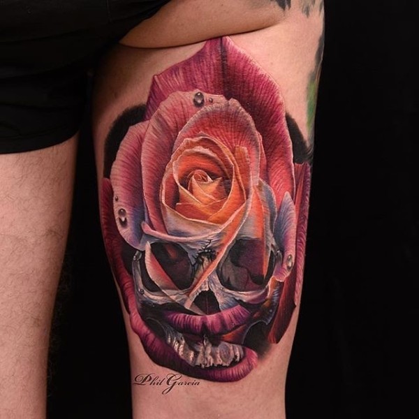 不寻常彩色玫瑰与人类骷髅纹身图案