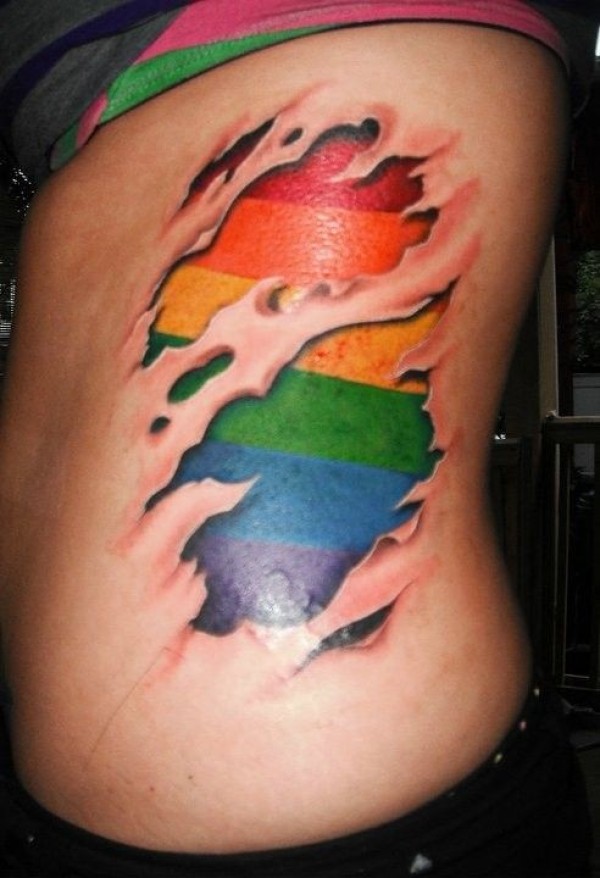 男性腰侧彩虹下皮肤撕裂纹身图案
