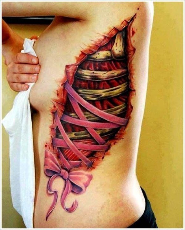 腰侧彩色写实肌肉皮肤撕裂纹身图案